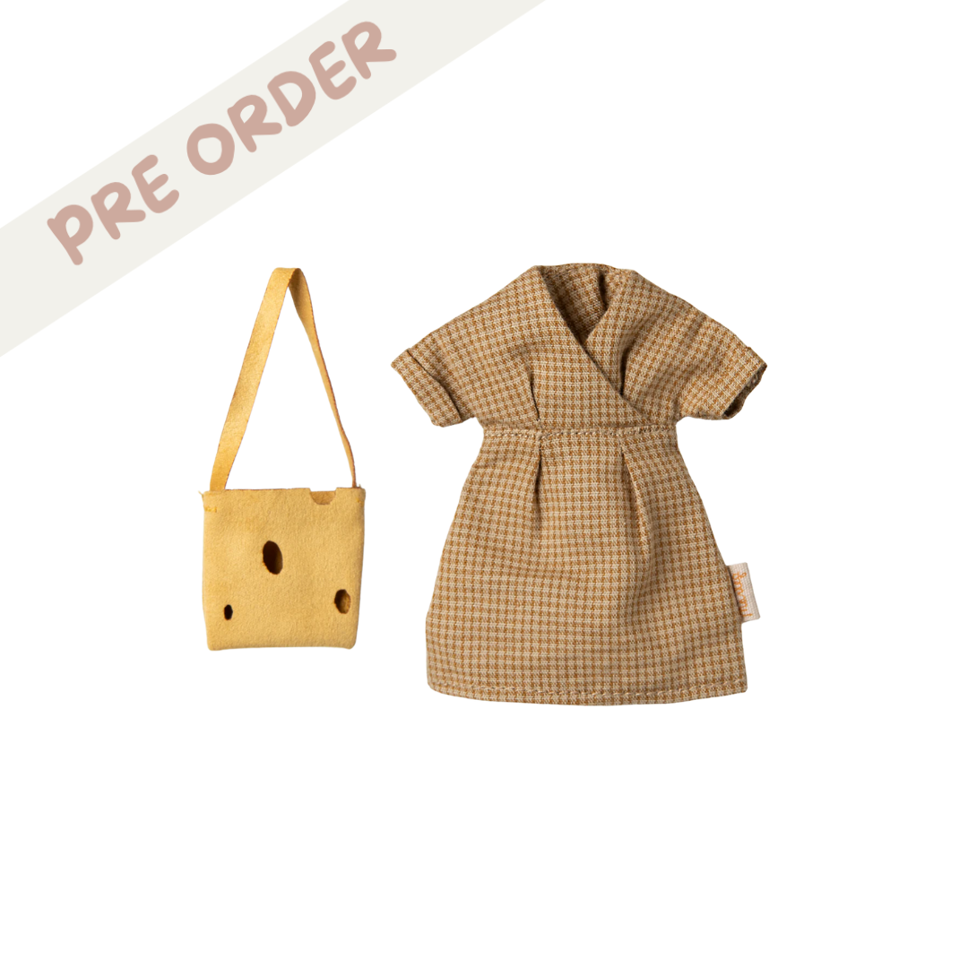 Maileg Mum Mouse Outfit - small check dress and a cheese hole bag
