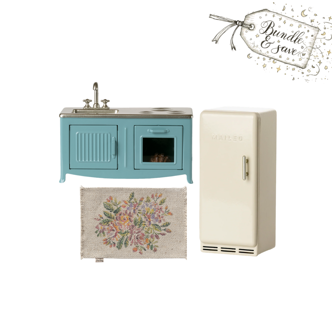 Complete Kitchen Setup: Includes a stove unit, fridge, and rug—ideal for creating a Maileg dollhouse kitchen.
