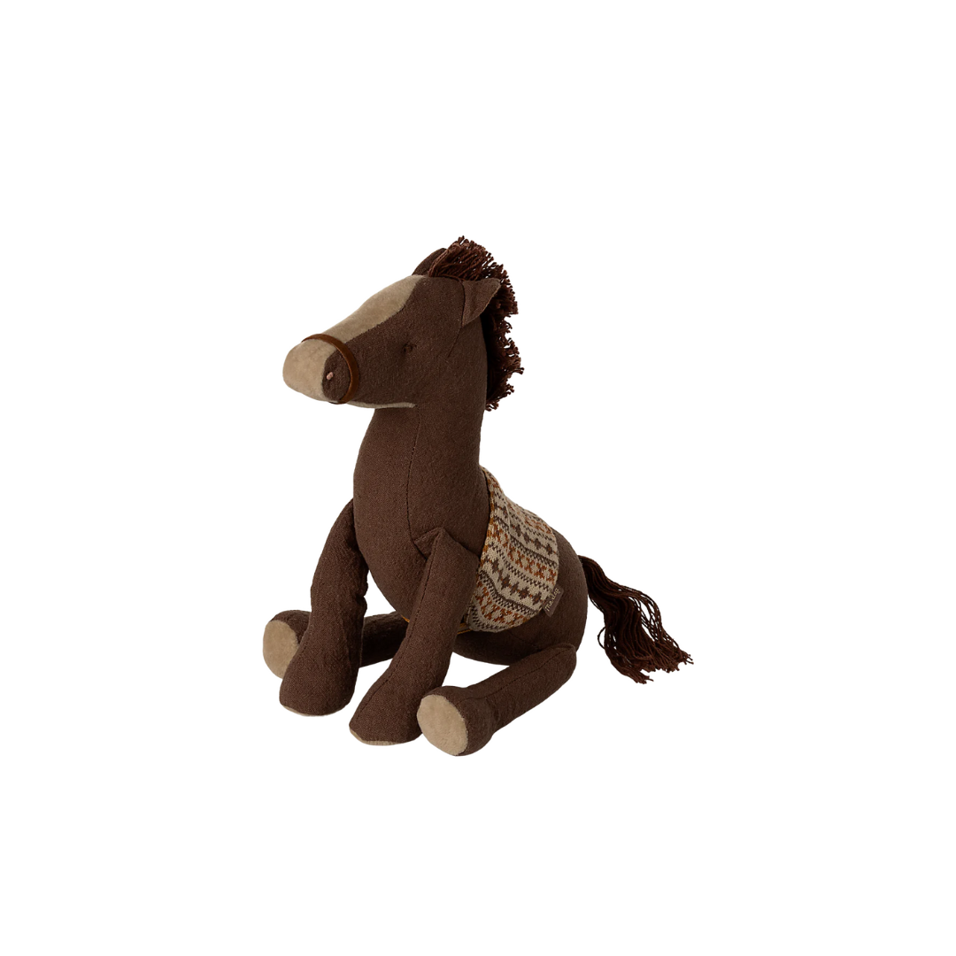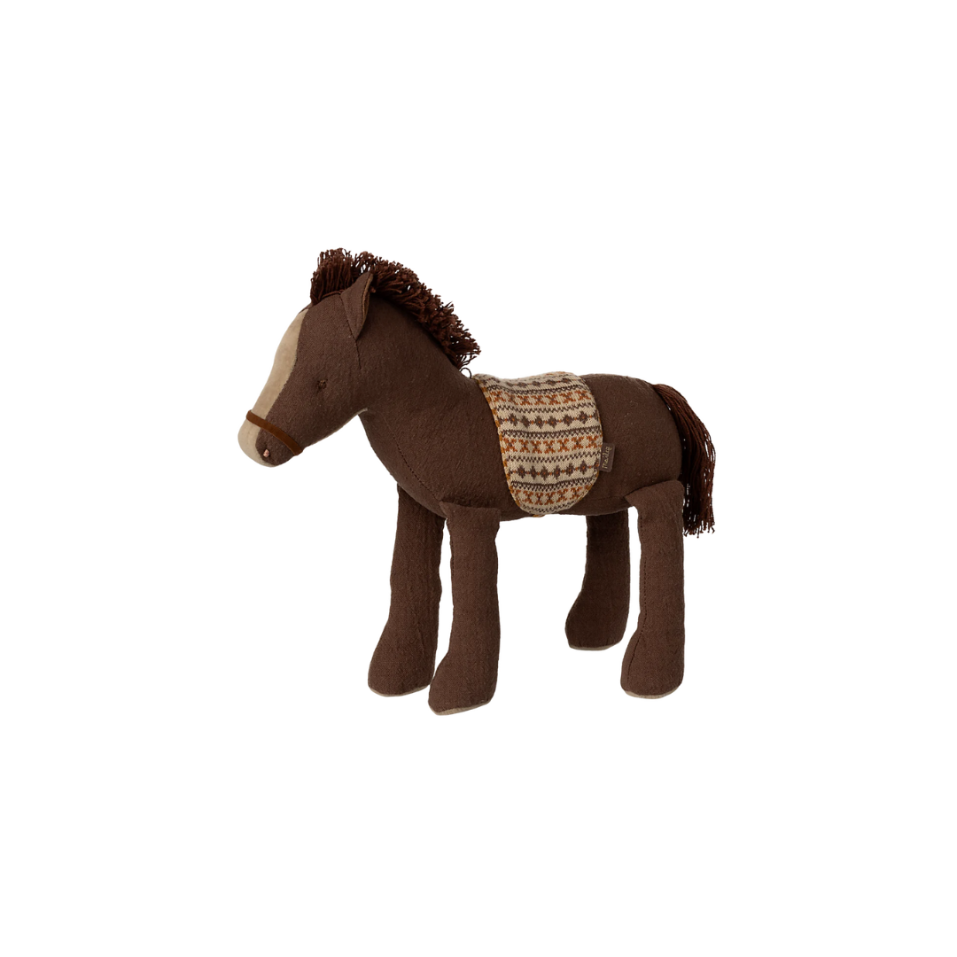 The brown pony is made in a soft cotton/linen fabric. The mane and tail is cotton strings and the saddle is made in soft knitted fabric that guarantees the ride will be comfortable.