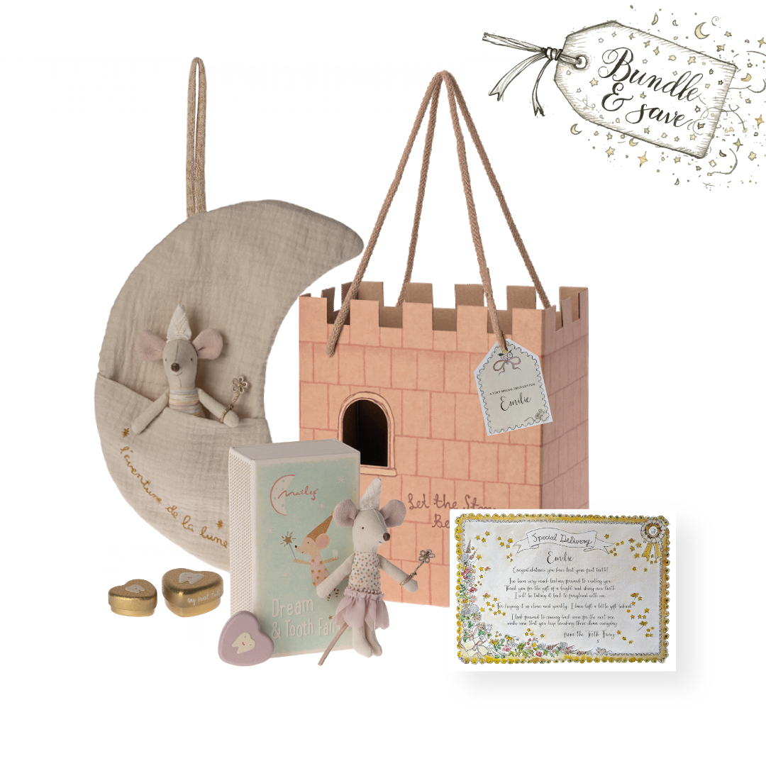 The perfect Maileg mouse tooth fairy gift box set, ideal for those just about to expect their very first visit from the tooth fairy. At nighttime the tooth fairy spreads her magical dust, brings treats and makes sure we all have sweet dreams.