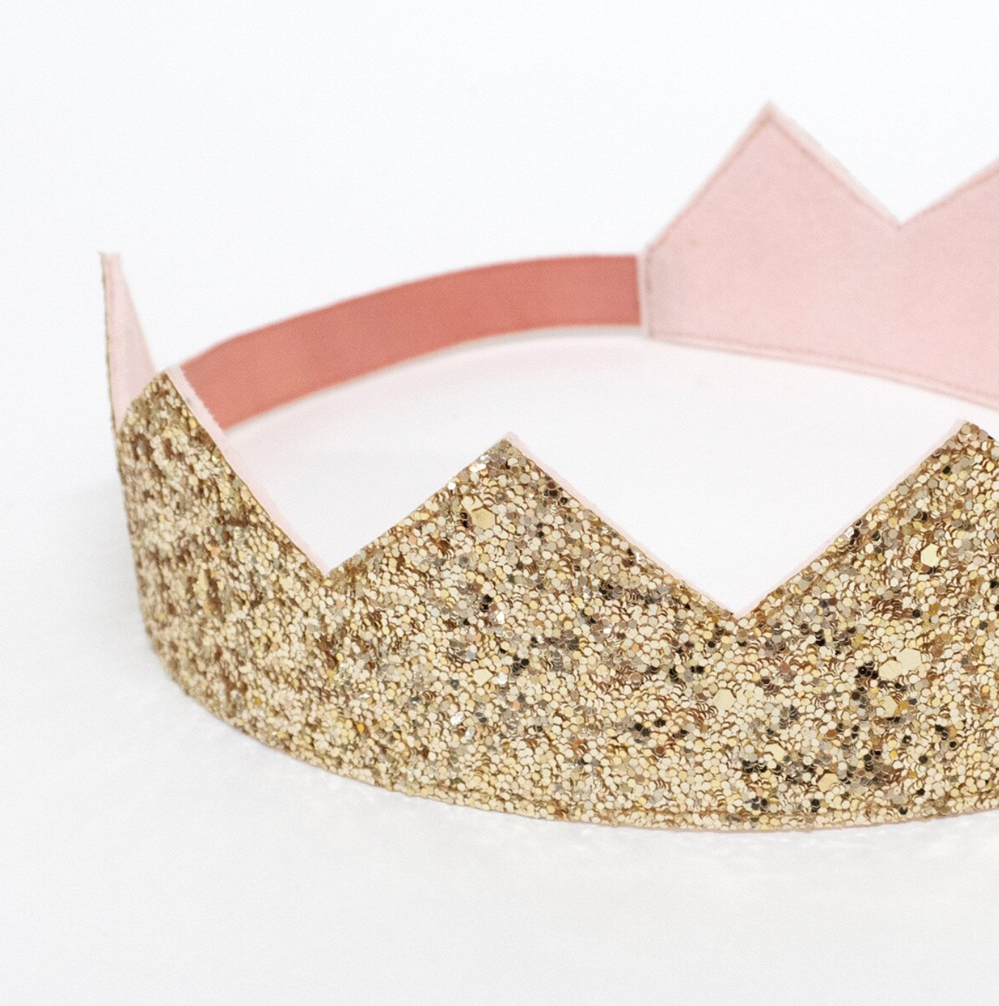 • The crown is crafted from a gold glitter fabric on the outside, pink felt on the inside, and has elastic at the back