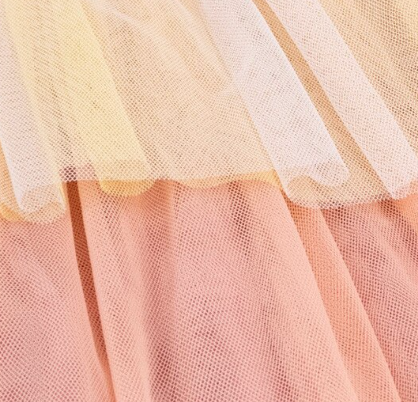 • The dress is crafted from layers of tulle in mint, pale yellow, peach pink and dusky pink