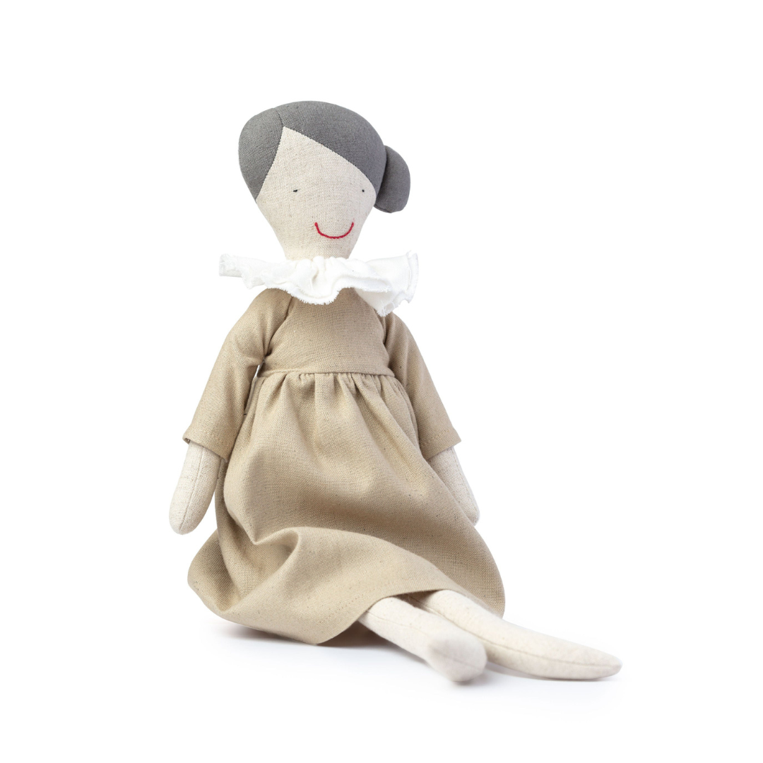 She is made from 70% cotton and 30% linen, with a 100% recycled polyester fill, combining softness, durability, and eco-conscious design.