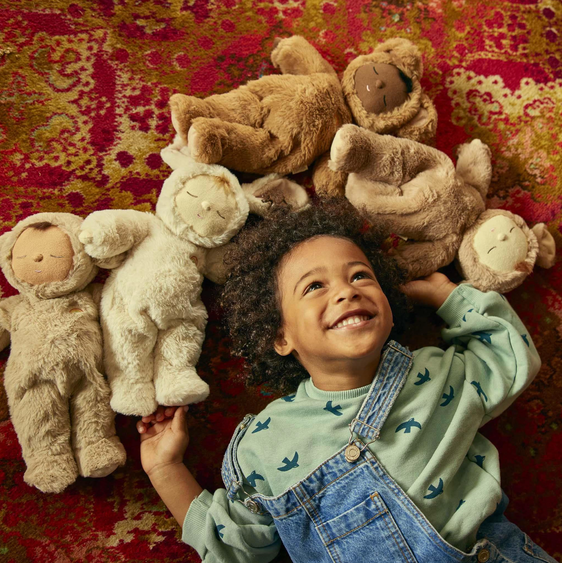 Mousy Pickle is posable, made from the plushest outer and features the sweetest embroidered face with a little tuft of hair. Each Cozy Dinkum wears a non-removable suit with two soft furry ears and a rainbow right over their heart.