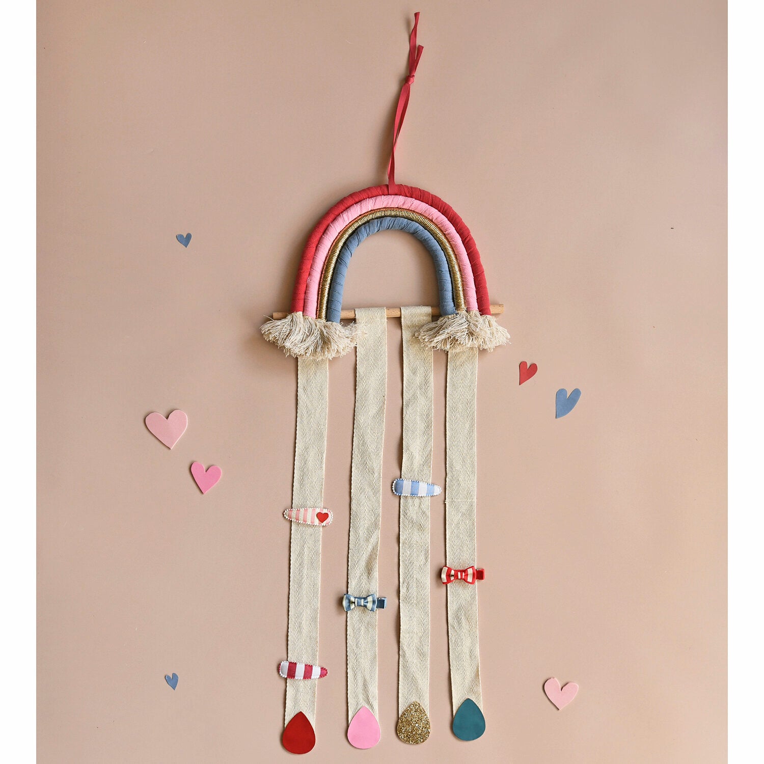 Bright, practical, and beautifully designed, the Bright Rainbow Drops Clip Hanger is the perfect solution for keeping hair clips neatly stored in one place. Part of the Rockahula Kids SS26 collection, this colourful organiser features a fabric rainbow in cheerful tones with four hanging strips attached to a wooden bar.