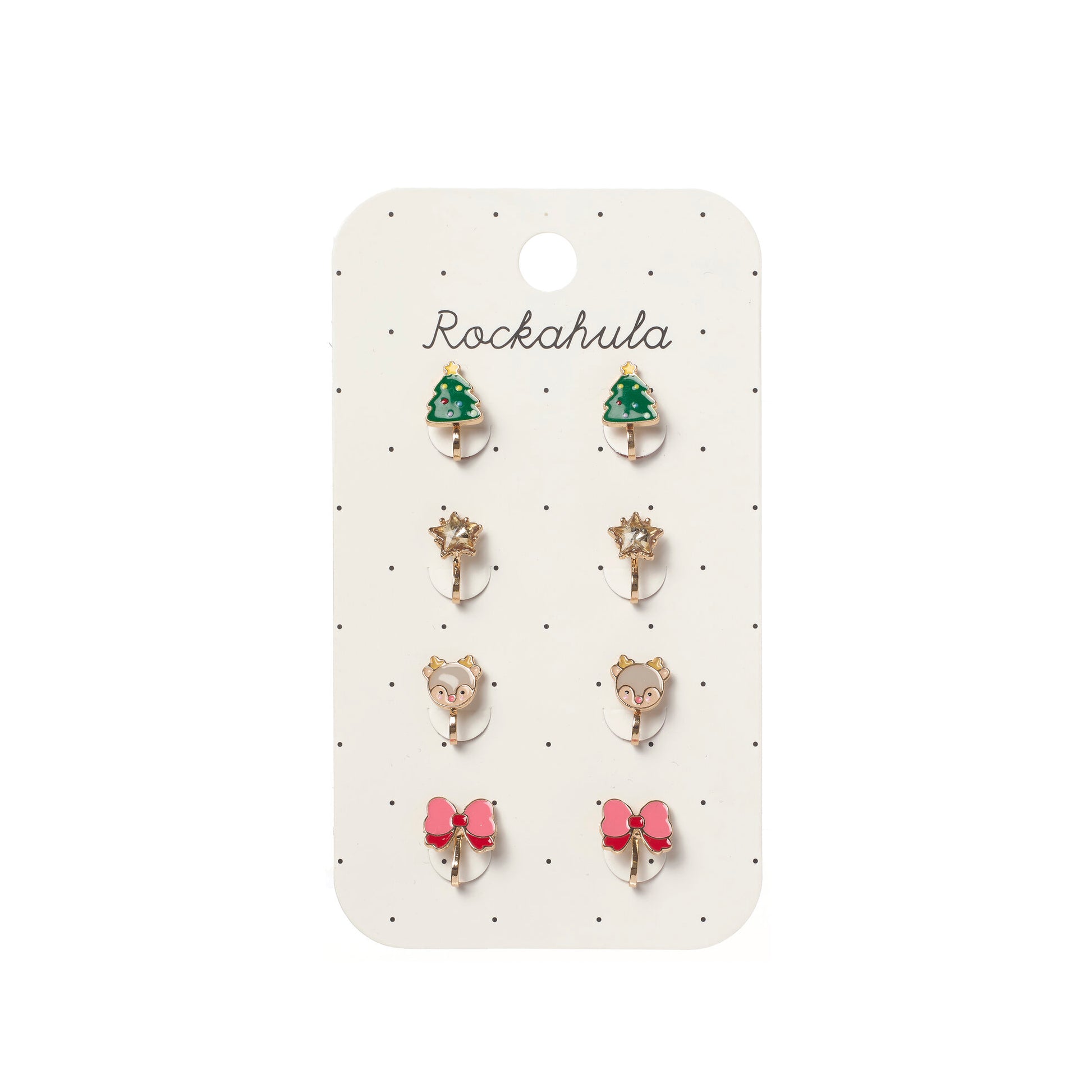 Add a sprinkle of Christmas cheer with this set of clip on earrings. This festive four pack features a set of little reindeers, Christmas trees, twinkling gems and sweet pink bows- all sat on metal gold clips. Each piece clips on gently (no pierced ears needed) and have been designed with little ears in mind!